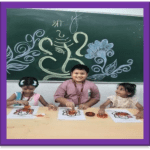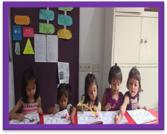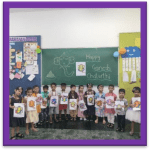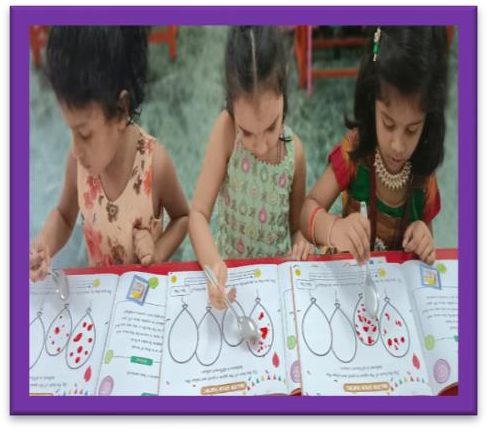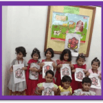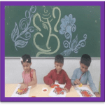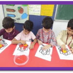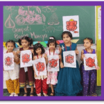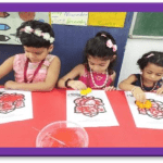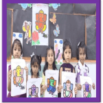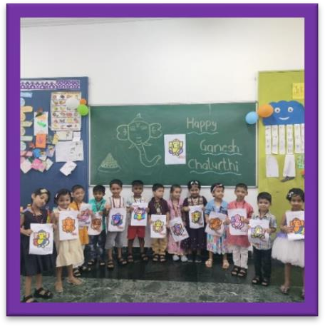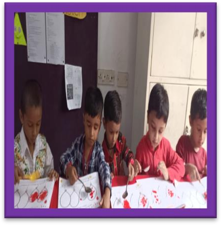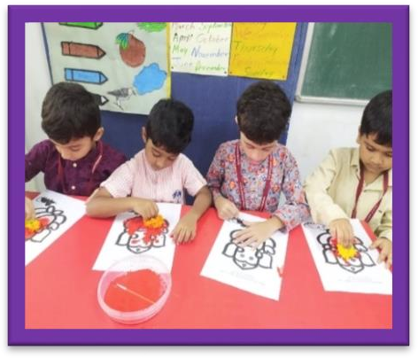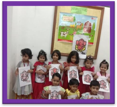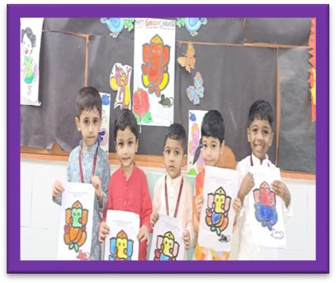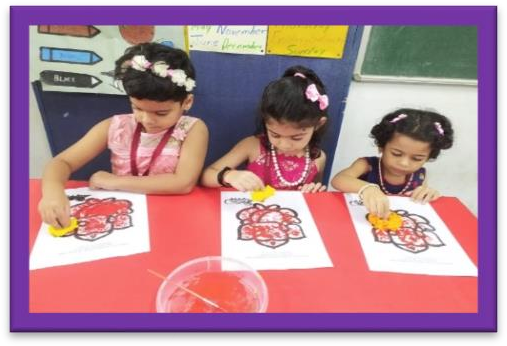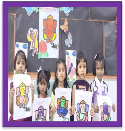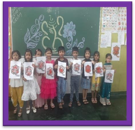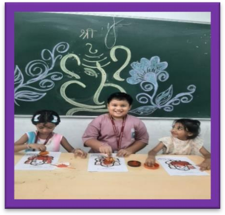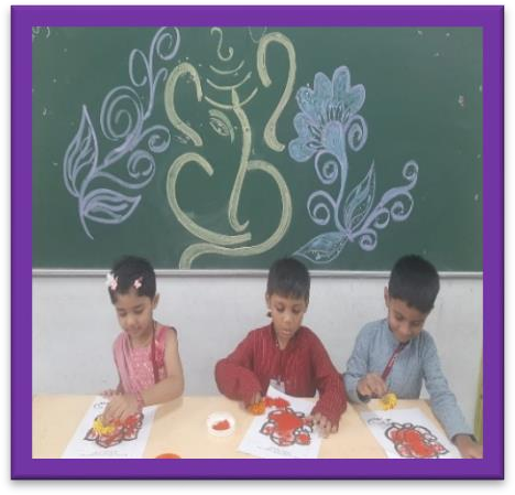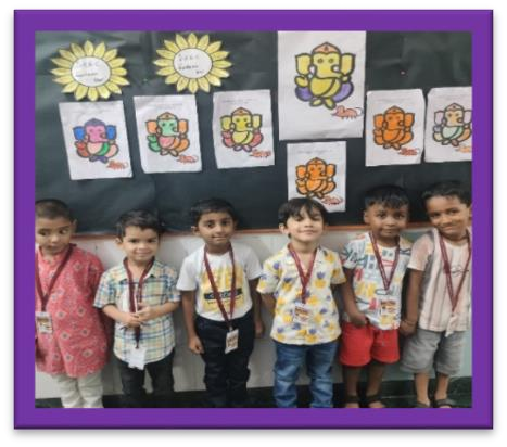 During the celebration, Jr. K.G. students engaged in spoon printing on a balloon image, while Nursery and Sr. K.G. students practiced cotton dabbing on a Ganesh image. The enthusiastic students named many red objects they had with them.