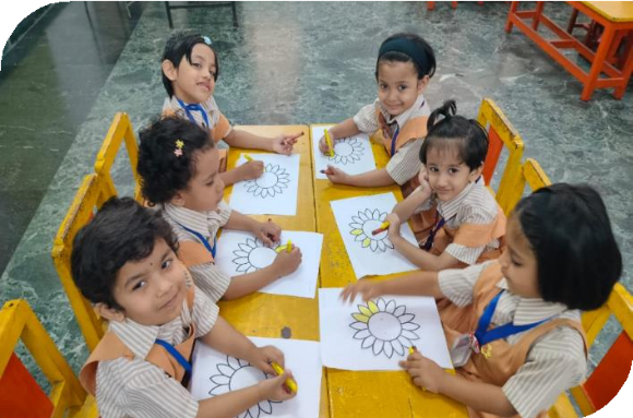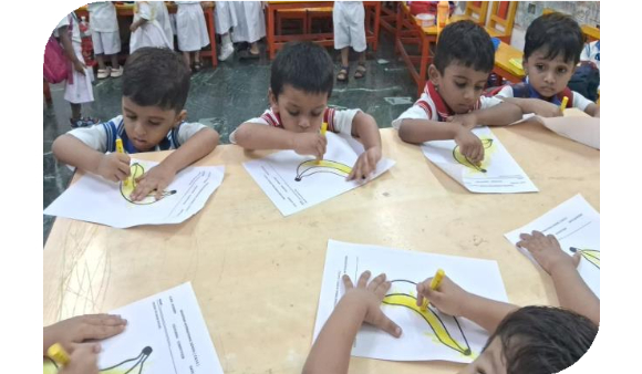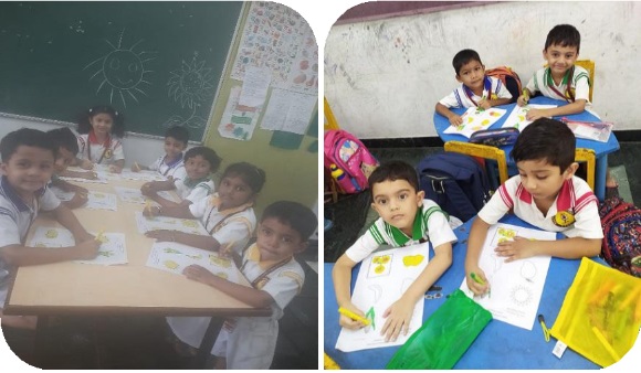 The recent celebration encompassed a variety of activities centred around colouring. The Sr.KG. students engaged in colouring images that included the sun, corn, sunflower, banana, mango, and lemon. Meanwhile, the Jr.KG students participated by colouring a large sunflower and a yellow t-shirt. In addition, our Nursery students enjoyed colouring a banana.